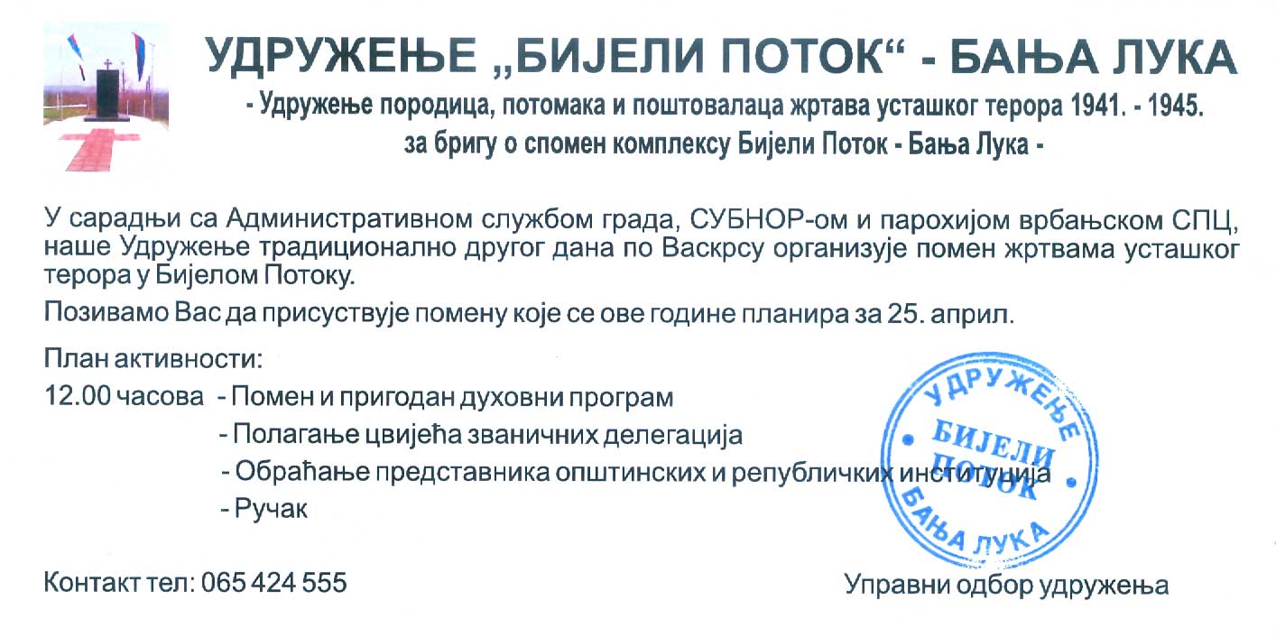 У сарадњи са Административном службом града, СУБНОР-ом и парохиjом врбањском СПЦ, наше Удружење традиционално другог дана по Ускрсу организуjе помен жртвама усташког терора у Биjелом Потоку