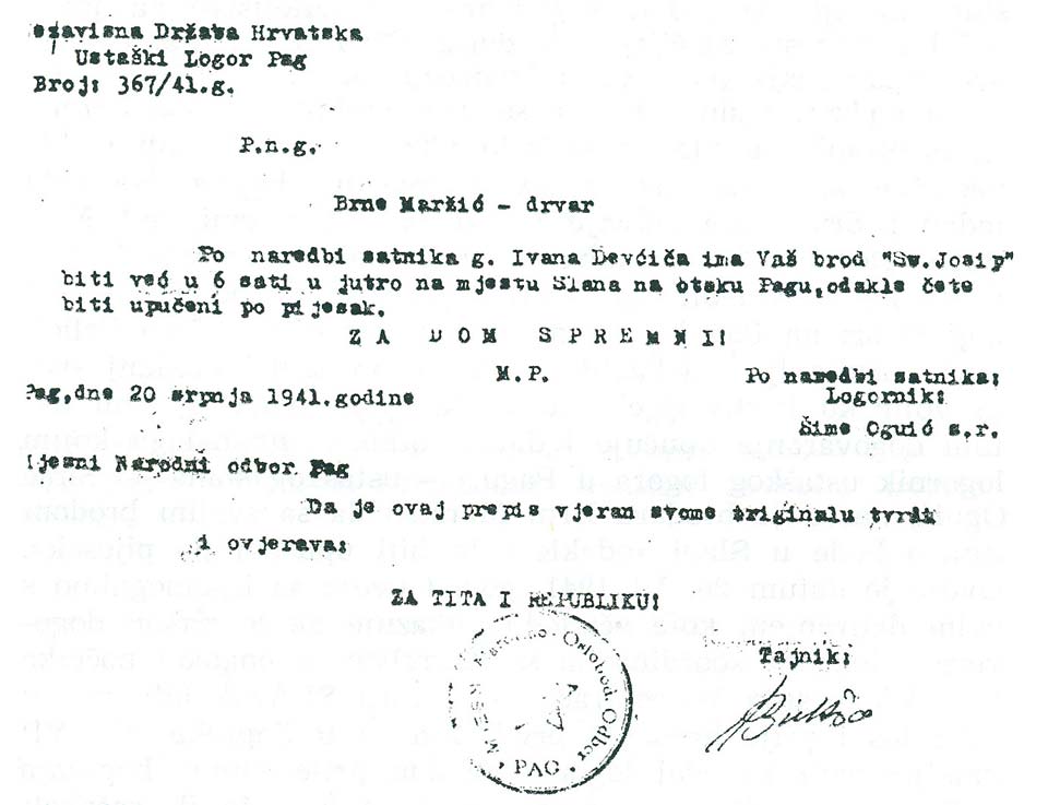 We need to take a serious look at the Ustasha order of the political Camp Officer in Pag, Šime Oguić to Brne Maržić! Oguić told Maržić to be in Slana in the morning of 21st. (“… your boat ‘St. Joseph’ needs to be at Slana site on the island of Pag as early as 6am…”!)