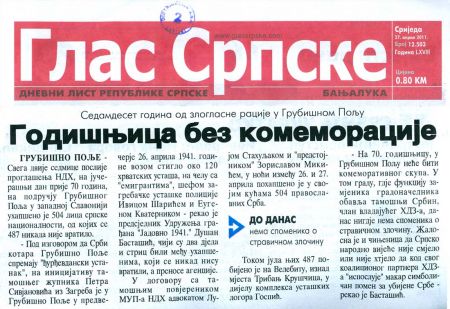 „На 70. годишњицу, у Грубишном Пољу неће бити комеморативног скупа. У том граду, гдjе функциjу замjеника градоначелника врши тамошњи Србин, члан владаjућег ХДЗ-а, данас нигдjе нема споменика о стравичном злочину.
