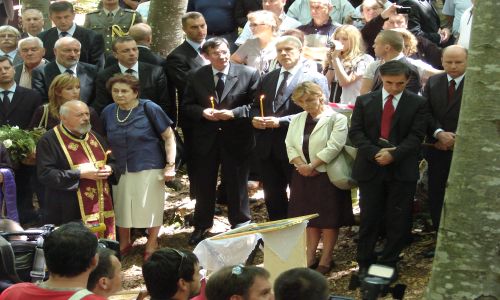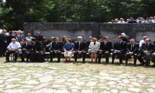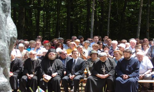 Уз бројне вјернике свијеће у својим рукама имали су и предсједник Србије Борис Тадић, предсједник СНВ Милорад Пуповац, амбасадор Србије Станимир Вукићевић и други истакнути гости који су се након верског обреда поклонили жртвама пред јамом.