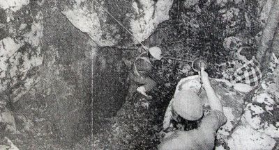 Drugi se u jamu spustio Dragan Maksimović, a treći speleolog dipl. arh. Dragan Mirović bio je na površini, nadgledajući spuštanje svojih kolega i, kasnije, pomažući i obezbeđujući spuštanje i izvlačenje dvojice snimatelja sa filmskom i TV-kamerom, Miodraga Pavlovića Caleta i Dragana Markovića, kao i našeg foto reportera Željka Jovanovića. Njima je zaista trebala stručna pomoć, s obzirom na to da su u rukama držali kamere, a i inače – jer nemaju iskustva ove vrste. Sve se odigravalo u napregnutoj tišini. Danimir Ristić je spretno sišao nekoliko metara u grotlo sa upaljenom acetilenskom bakljom na šlemu, a onda počeo da u stenu ukucava prvi “spit”, specijalni alpinistički klin sa čeličnom alkom, kroz koju je provukao svoj rezervni konopac.