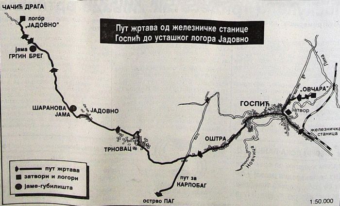 U prvo vrijeme u ove zbirne logore dovodili su Srbe i komuniste sa područja Like, Kninske Krajine, Korduna i dijelova Gorskog kotara, a kad osnovaše logor Jadovno, od 24. juna i logor – gubilište na Pagu, od 25. istog mjeseca otpočeše svakodnevno dovođenje cirka po 1.000 ljudi s područja cijele Hrvatske, Bosne, Hercegovine i Vojvodine. Srbe i Židove prevozili su teretnim željezničkim kompozicijama sastavljenim od 30-35 stočnih vagona i u svakom prosječno 75-90 ljudi, žena i djece…“