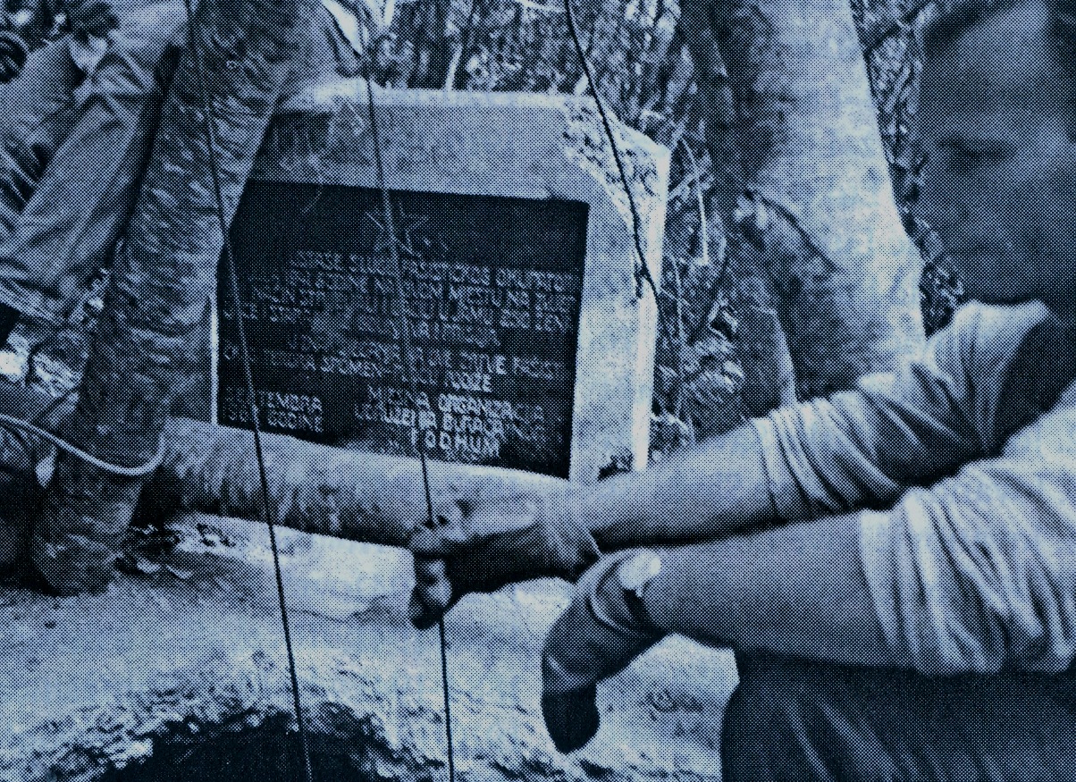 Будо Симоновић креће у амбис jаме Равни долац 3.6.1991.Педесет година касниjе над jамом Равни долац - свиjећа, крст и пушка