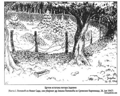 Цртеж остатака логора Јадовно 26. jула 1947, Костe Ј. Поповићa из Новог Сада, синa убиjеног др Јована Поповића из Сремских Карловаца. Ђуро Затезало, Јадовно – комплекс усташких логора 1941, Београд 2007, књ. I, стр. 276.
