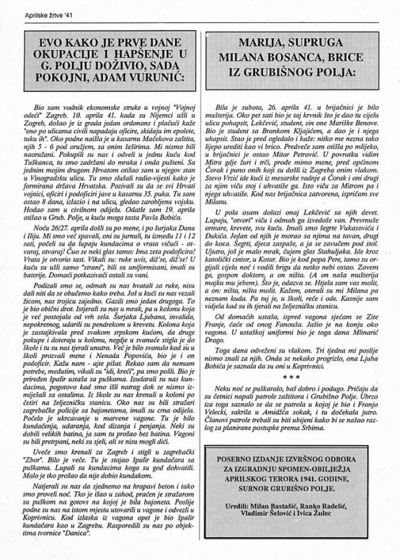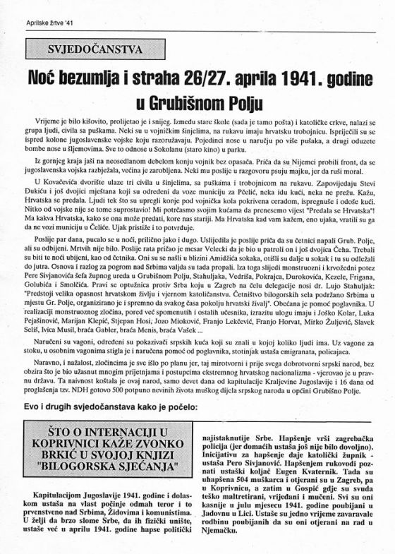 Početkom marta 1991. godine predao sam Grubišnopoljskom listu širu informaciju o događajima u Grubišnom Polju aprila 1941. godine. Naslov je bio „Svjedočanstva“, a veliki podnaslov „Noć bezumlja i straha 26. i 27. aprila 1941. godine u Grubišnom Polju“. Reče mi Rade Malešević, novinar u pomenutom listu, da remitende nije bilo! Bilo je to veliko istorijsko saznanje o zločinu koji je gotovo zaboravljen, a tinjao je kao prigušena tuga u svim srpskim porodicama Bilogore i Grubišnog Polja. Navedeni su imenom i prezimenom svi lokalni akteri, zločinci. Sad su ih svi imali prilike dozvati u sjećanje. Pored stranih prezimena, koji su poveli to krvavo aprilsko kolo 1941. godine, tu su i dobro poznata domaća, autohtona prezimena. To je sada žuljalo potomke, rodbinu i znance tih zločinaca, a pet stotina monstruozno ubijenih nevinih komšija Srba, nikad nije dirnulo njihovu savjest u prošlih pedeset godina.