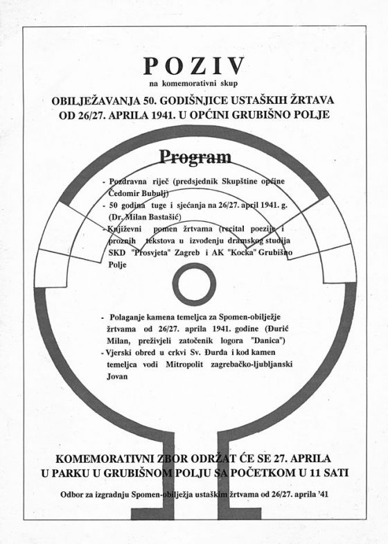 Izvršni odbor za izgradnju spomen-obilježja žrtvama aprilskog terora 1941. godine je u Grubišnopoljskom listu 29. marta 1991. godine objavio sljedeći prilog: