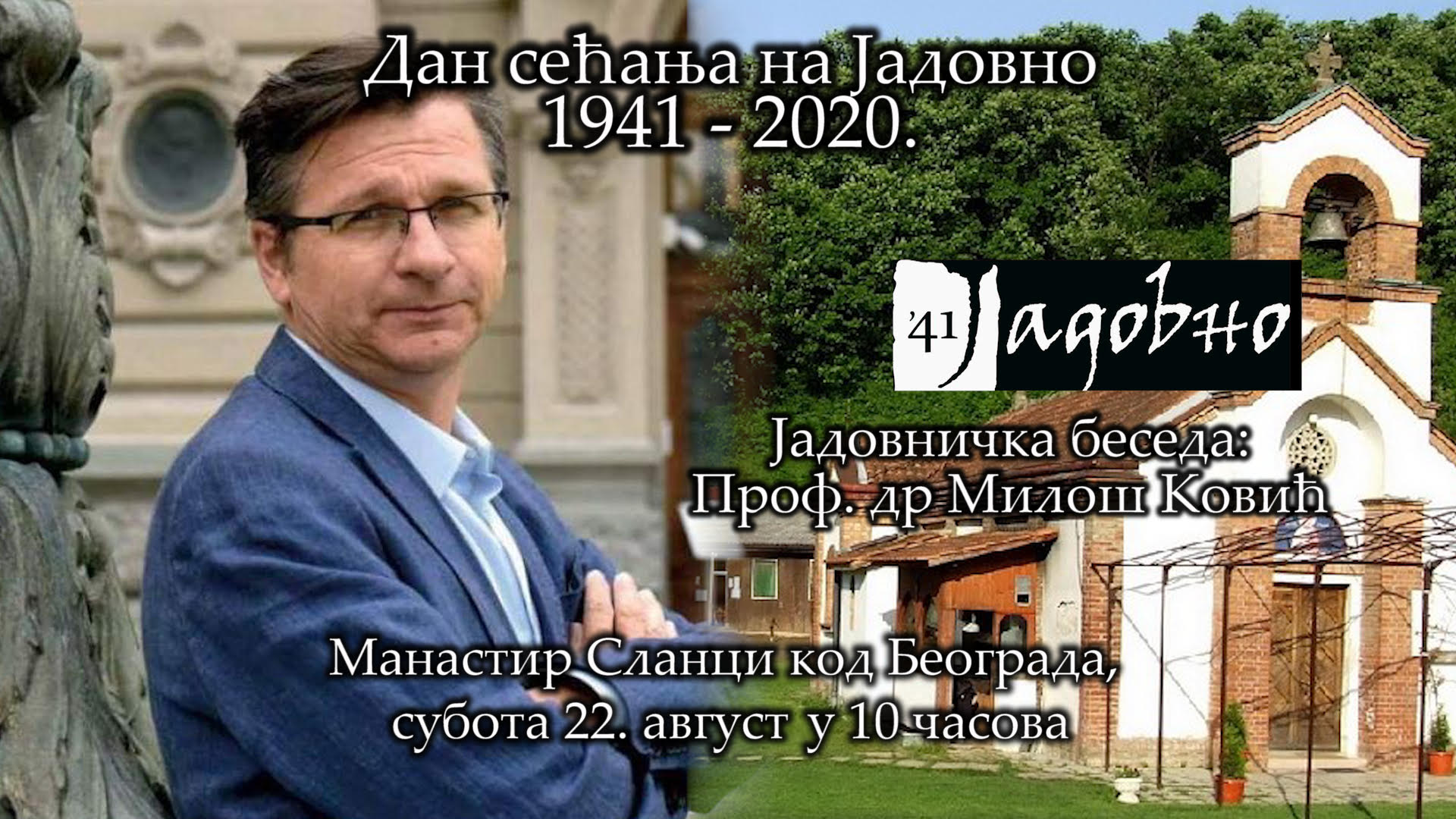 Једанаесту годину за редом, 79 година од страдања, обележићемо „Дан сећања на Јадовно 1941 – 2020.“ Због пандемије и забране уласка у Р. Хрватску, 22. августа у 10 часова, окупићемо се у манастиру Св. Архиђакона Стефана у Сланцима код Београда.