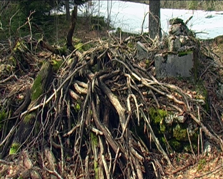 Da bi bio prikriven, minirani spomenik je prekriven trulim stablima i granjem.