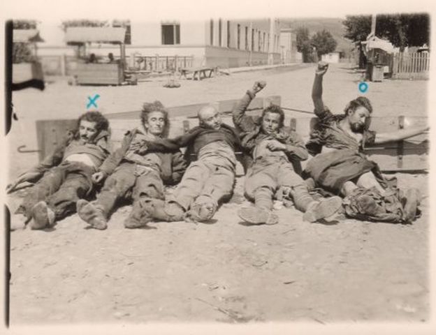 Miloš Gagić (obeležen sa X), Miodrag Kostić (obeležen sa O), učitelj u selu Velika Drenova, i njihova tri saborca čija su tela izložili nacisti u Trsteniku kao opomenu. Imena ostalih nisu poznata