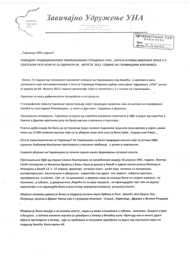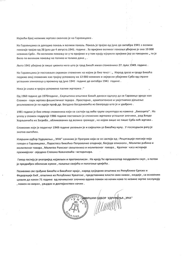 04. августа 2012. године са почетком у 11.00 часова у Гаравицама одржаће се традиционално обиљежавање страдња Срба, Јевреја и Рома Бихаћа и Бихаћког краја. У овом мјесту прије 71 годину, у љето 1941. године, звјерски је побијено преко 12 000 невиних жртава.