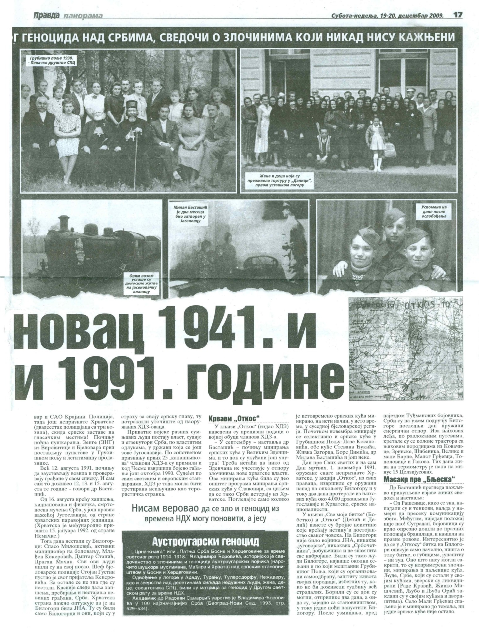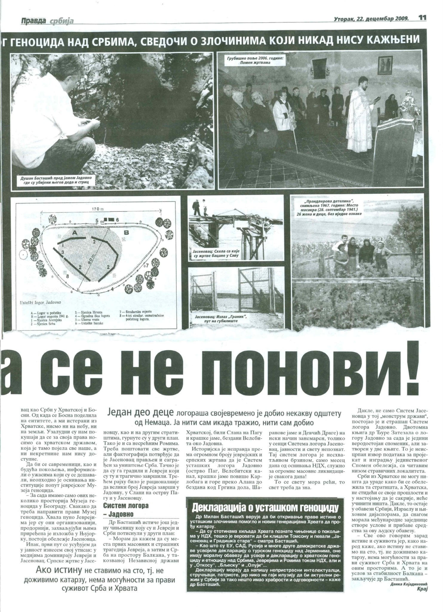 Др Басташић указуjе на понављање метода НДХ и трагичну судбину хиљада Билогораца 1941. до 1945. године. 26. и 27. априла 1941. усташе су дигле из кревета 504 Србина из Грубишног Поља и околних села. Отерани су у логор “Даница” код Копривнице, одатле у Госпић, па у Јадовно на Велебиту и Слану на отоку Пагу. Из „Данице“ се вратило неколико стараца, jедан дечак млађи од 16 година и неки из мешовитих бракова. Сви остали су завршили у незапамћеним мукама: од маља, секире, или полуживи у ланцима стрмоглављени су у бездане Велебита. Неки су заклани током транспорта подвелебитским каналом према отоку Пагу. Постоjе озбиљне индициjе и докази да их jе значаjан, али неутврђен броj, завршио у голготи Слане на отоку Пагу. Сведока о овим стратиштима наших очева, браће и родбине дуго ниjе било.