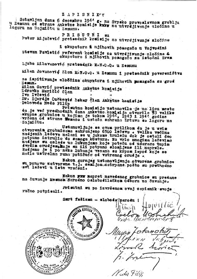 - С тим у вези, на изложбеним постаментима/сликама стоји текст: „ОСТАЦИ ЛЕШЕВА СА САЈМИШТА, ИСКОПАНИХ НА ЈЕВРЕЈСКОМ ГРОБЉУ У ЗЕМУНУ, 6. XII 1944. g.“.