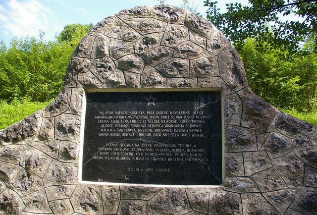 »НА ОВОМ МЈЕСТУ АУГУСТА 1941. ГОДИНЕ КРВОЖЕДНЕ СЛУГЕ МРСКОГ ОКУПАТОРА НА ЗВЈЕРСКИ НАЧИН УБИЛИ СУ ОКО 2400 НЕВИНИХ ЖРТАВА–ЉУДИ, ЖЕНА И ДЈЕЦЕ ИЗ ВЕЛИКЕ КЛАДУШЕ, ЦРНОГ ПОТОКА, ГЛИНИЦЕ, ПОЉАНЕ, ПОНИКАВА, ГЕЈКОВЦА, ВРГИН-МОСТА, ШИЉКОВАЧЕ, МАЉЕВЦА, ШМРЕКОВЦА, КРСТИЊЕ, БРУСОВАЧЕ, ЈАГРОВЦА, СВИНИЦЕ, ШИРОКЕ РИЈЕКЕ, БУХАЧЕ И ДРУГИХ ОКОЛНИХ СЕЛА ОВОГ КРАЈА.