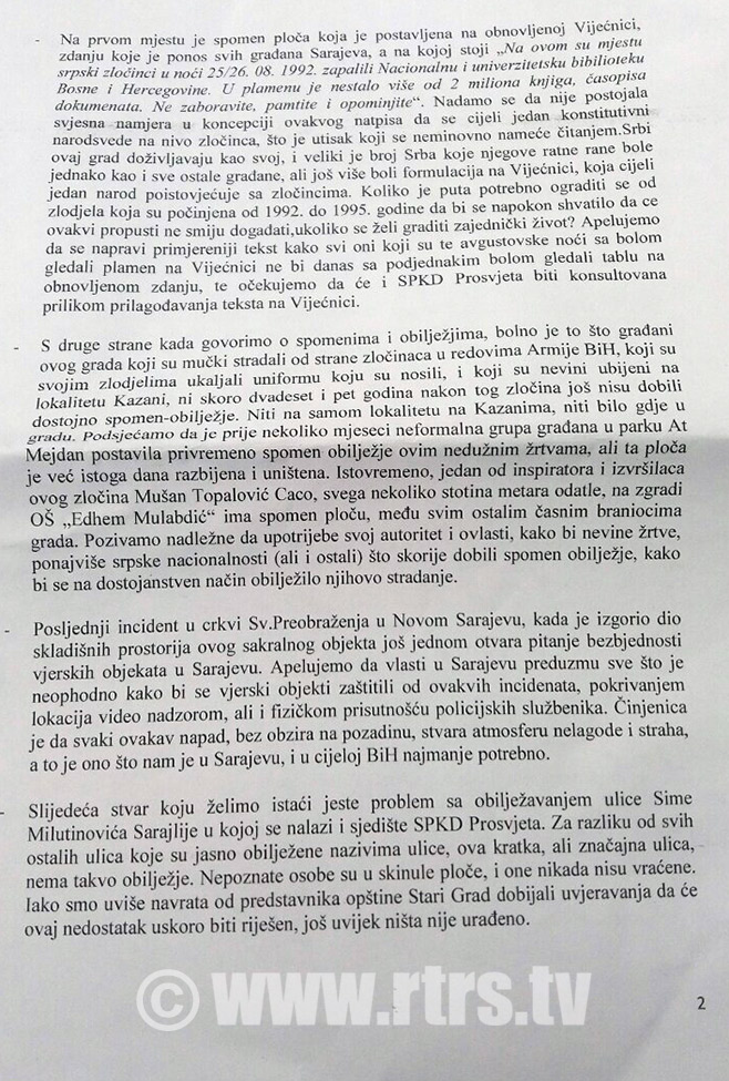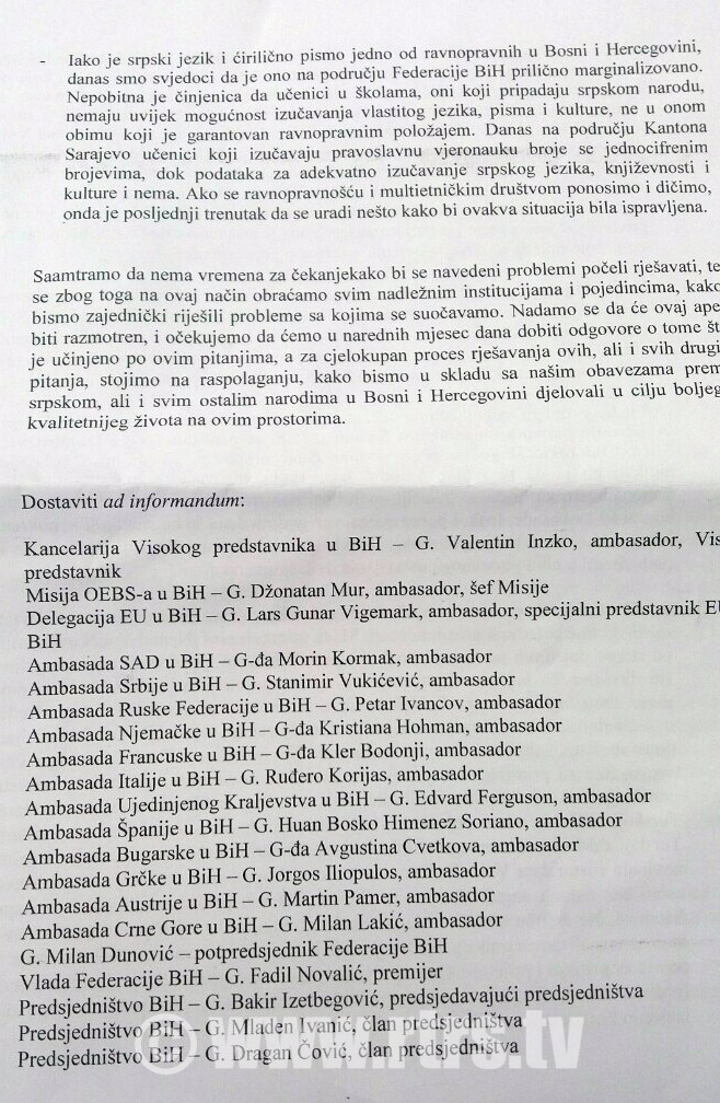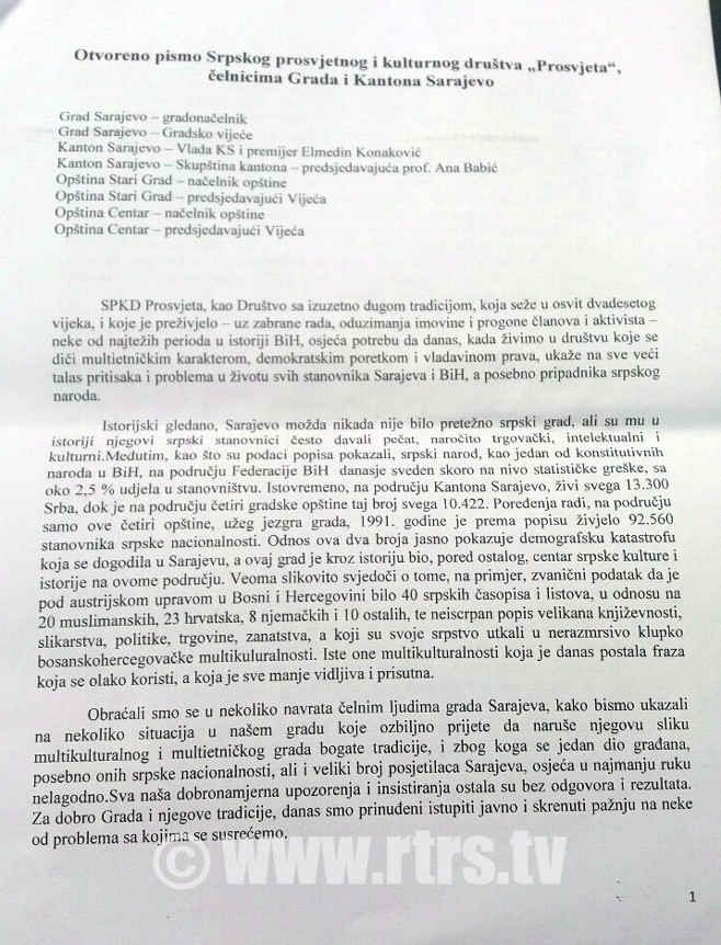Огорчени дискриминацијом Срба у Сарајеву и Федерацији БиХ, окупљени око сарајевског огранка „Просвјете“ упутили су отворено писмо сарајевским, босанскохерцеговачким, званичницима Федерације БиХ, те представницима међународне заједнице и дипломатама.