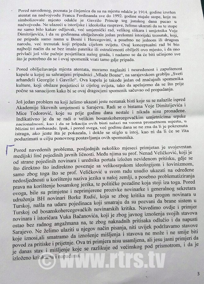 Оронула је капела Младе Босне. Уклоњени су и отисци стопала Гаврила Принципа, свједочанство сарајевског атентата, дјело Воје Димитријевића, чија је биста, заједно са бистом Мице Тодоровић нестала испред Академије ликовне умјетности. Бришу неизбрисиве трагове српског постојања, поручују из сарајевске Просвјете и захтјевају у наредних мјесец дана конкретне потезе којим ће се у граду који често истиче своју мултиетничност Србима вратити достојанство.