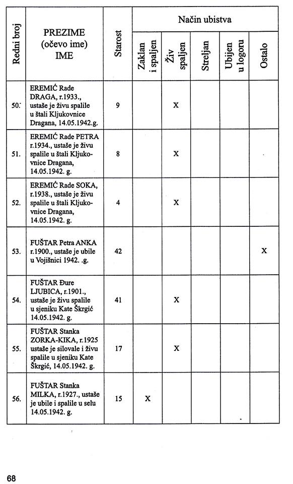 Кордун, село Војишница крај Војнића. Усташе су 14. маја 1942. године, у кућама Станка Кнежевића, Миле Новаковића, Милице Ђурић, Драгана Кнежевића, Стевана Кнежевића и у штали Кате Шкргић, поклале 189 српских сељака од којих 93 дјетета у старости до 14 година (1.)