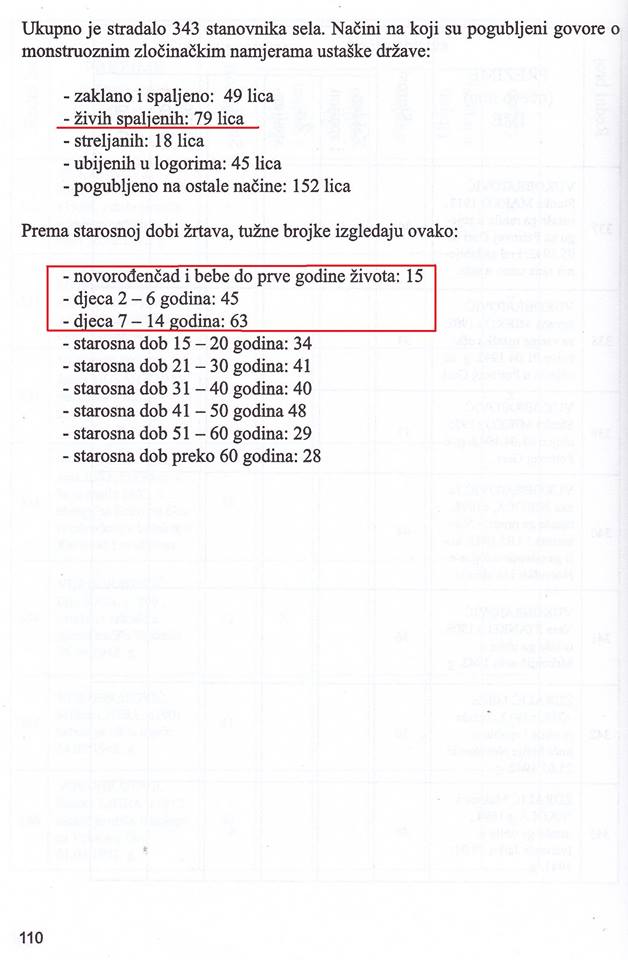 Од укупно 650 становника село је имало 343 цивилне жртве. Кад се томе придодају борци и умрли од директних посљедица ратних страдања, нестало је практично 2/3 села.