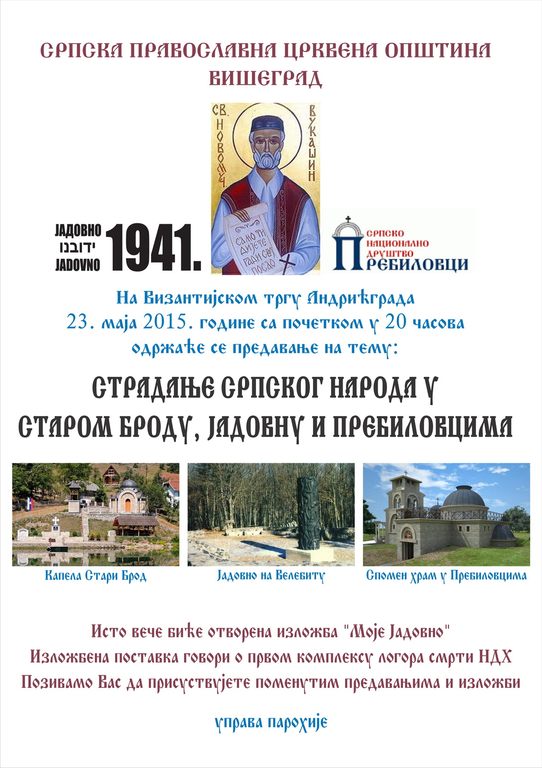 У суботу, 23. маjа 2015. у 20 часова, у простору Визатиjског двора у Андрићграду, одржаће се предавање под насловом «Страдање Срба у Старом броду, Јадовну и Пребиловцима.