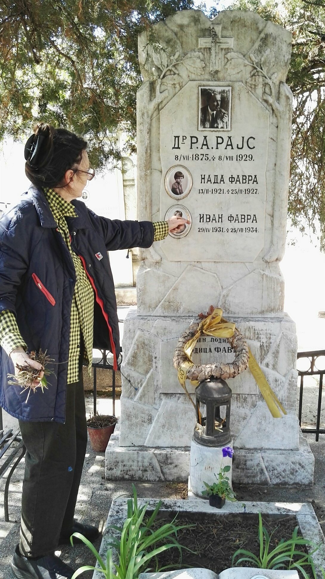 „Ево погледајте, овде леже Нада и Иван Фавра, као и Димитрије Серж Фавра, а од 2010. године и његова супруга, коју сам добро познавала, Јола Фавра, рођена као Славка Гачић…Почистим мало, средим, када год могу дођем обиђем, трудим се да гробна места ових људи буду видљива, да не падну у заборав…” прича ми врло смирено и сталожено док рукама чупка травицу око споменика.